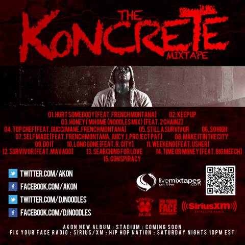 Akon has decided to give back to the streets that made him with a brand new free mixtape. As many have become leery of the release his oft-delayed album Stadium, the worldwide hitmaker delivers this new project to hold fans over, as he continues to prep the LP. With his latest Jerry Wonda-produced street single, “Hurt Somebody” featuring French Montana, building buzz he teamed up with DJ Noodles for “The Koncrete” Mixtape.