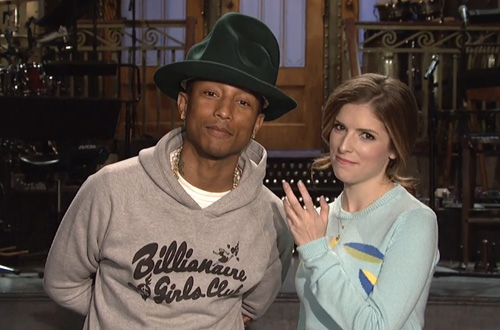 In advance of his appearance as the musical guest on “Saturday Night Live” this weekend, Pharrell Williams joins host Anna Kendrick in a series of promo clips. Wearing a green version of his now famous Buffalo hat and a Billionaire Girls Club hoodie, the future coach of NBC’s ‘The Voice‘ jokes about his famous headwear and his hit “Happy.”