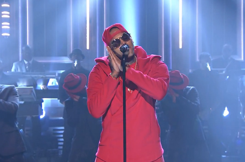 Backed by The Roots and dressed in all red, the R&B superstar performed a medley of the Diplo-produced title track off his new album X and his hit single “Loyal,” wowing viewers with his vocals and always impressive dance moves.